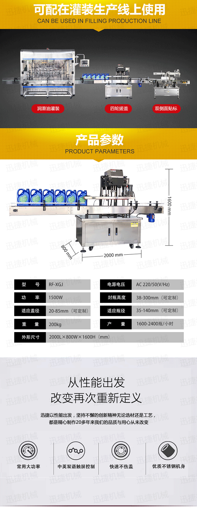 自動旋蓋機原理:電氣控制運動,穩定性強;設有定位裝置,旋蓋標準,操作方便;鎖蓋范圍寬,可鎖不同形狀規格的瓶蓋;解決了噴頭、泵頭、噴霧泵、手扣式噴頭旋蓋難的問題;鎖蓋轉速可調,可根據不同瓶蓋調節松緊度。