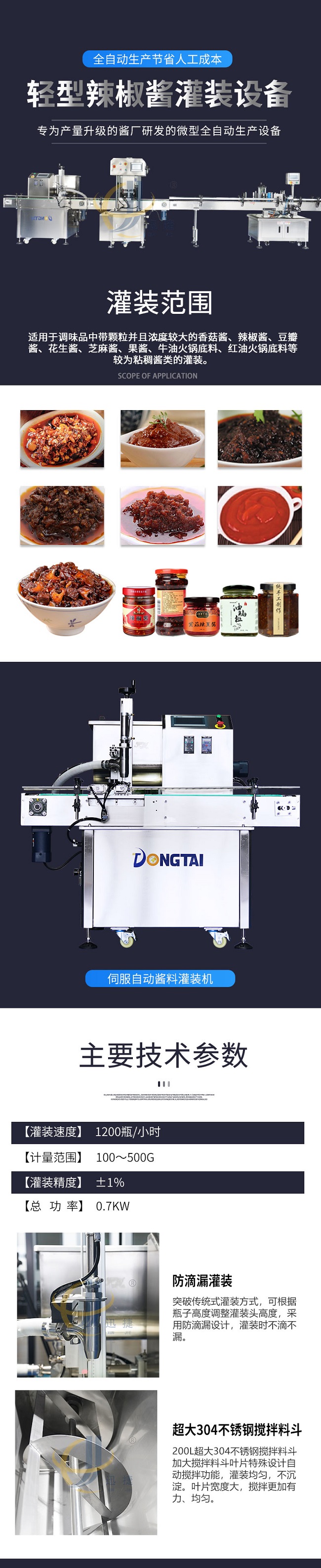 這款小型辣椒醬灌裝生產(chǎn)線是本公司專為產(chǎn)量升級(jí)的醬廠研發(fā)的微型全自動(dòng)生產(chǎn)設(shè)備,適用于調(diào)味品中帶顆粒并且濃度較大的香菇醬、辣椒醬、豆瓣醬、花生醬、芝麻醬、果醬、牛油火鍋底料、紅油火鍋底料等較為粘稠醬類的灌裝。