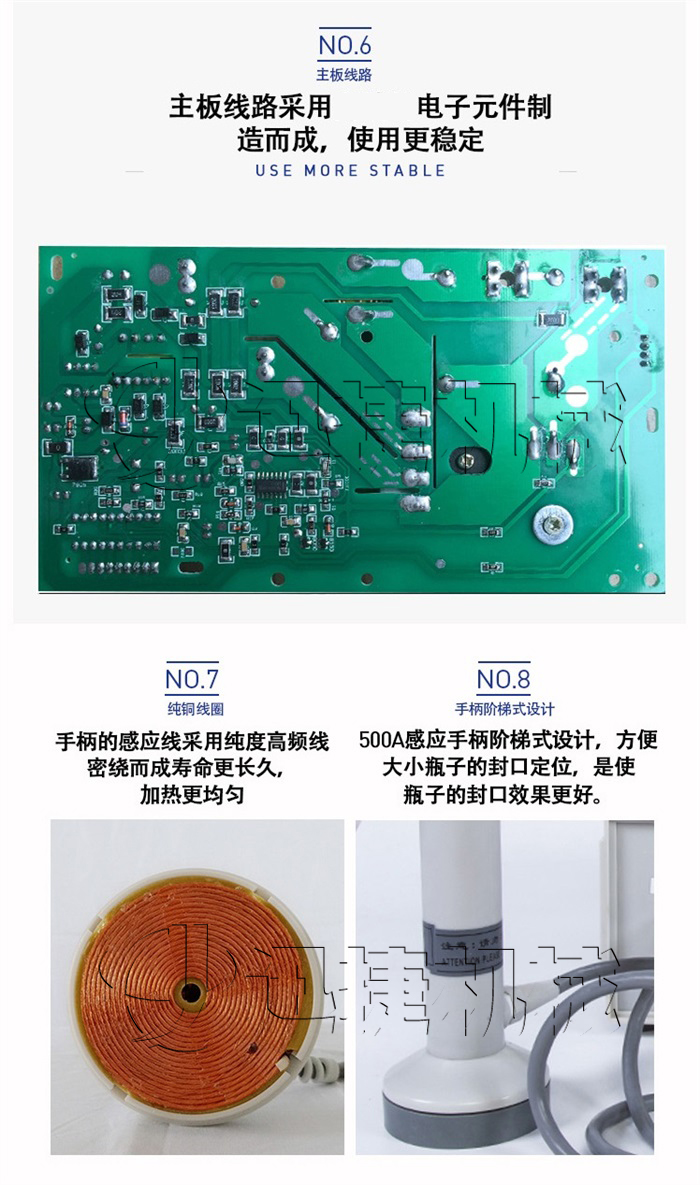 本手持式電磁感應鋁箔封口機是利用電磁感應的原理,將瓶口上的鋁箔片瞬間產生高熱,然后熔合在瓶口上,使達到封口的功能。具有良好的防潮、防霉、防偽作用,起到延長物品保存周期的目的。封口容器的材質可以是聚乙(PE)、聚丙烯(PP)、聚酯(PET)、聚苯乙烯(PS)、ABS以及玻璃等,不能用于金屬瓶體及瓶蓋。(本公司同時提供各種材料感應鋁箔膜)。