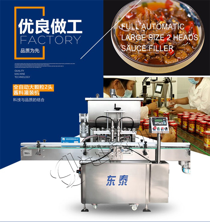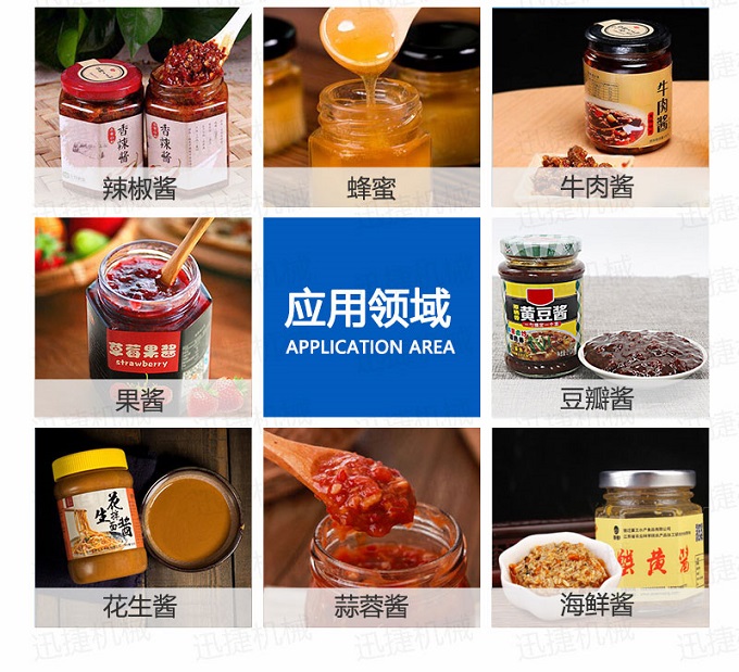 醬料灌裝機采用活塞式灌裝原理,適用于調(diào)味品中帶顆粒并且濃度較大的辣椒醬、豆瓣醬、花生醬、香菇醬、果醬、牛油火鍋底料、紅油火鍋底料、蝦醬等較為粘稠醬類的灌裝。